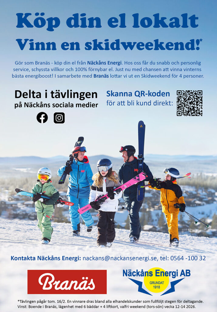 I samarbete med Branäs lottar vi ut en skidweekend för 4 personer! Du hittar tävlingen och instruktioner för att delta på våra sociala medier – Facebook & Instagram. Kampanjen pågår tom 16/2 – och alla som är eller blir elhandelskunder hos Näckåns Energi är välkomna att delta. Lycka till!